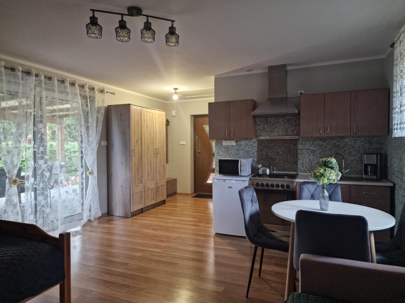 Dom z 1 sypialnią. The holiday homes kitchenette, which features kitchenware, is available for cooking and storing food. Featuring a terrace with garden views, this holiday home also provides a washing machine and a flat-screen TV with cable channels. The unit offers 2 beds. Dom wakacyjny - 4 osobowy. Powierzchnia pokoju ok.: 35 mkw.
