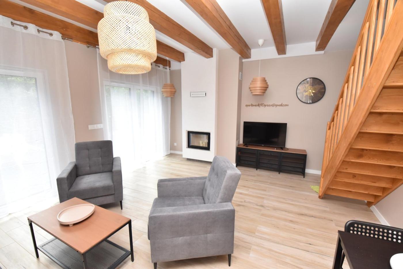 Apartament z 3 sypialniami. The fireplace is the standout feature of this apartment. Boasting a private entrance, this air-conditioned apartment features 1 living room, 3 separate bedrooms and 1 bathroom with a bath and a shower. Guests will find a stovetop, a refrigerator, a dishwasher and kitchenware in the kitchen. The apartment also comes with a barbecue. The spacious apartment features a washing machine, a tea and coffee maker, a seating area as well as a terrace with garden views. The unit has 4 beds. Apartament - 7 osobowy. Powierzchnia pokoju ok.: 84 mkw.