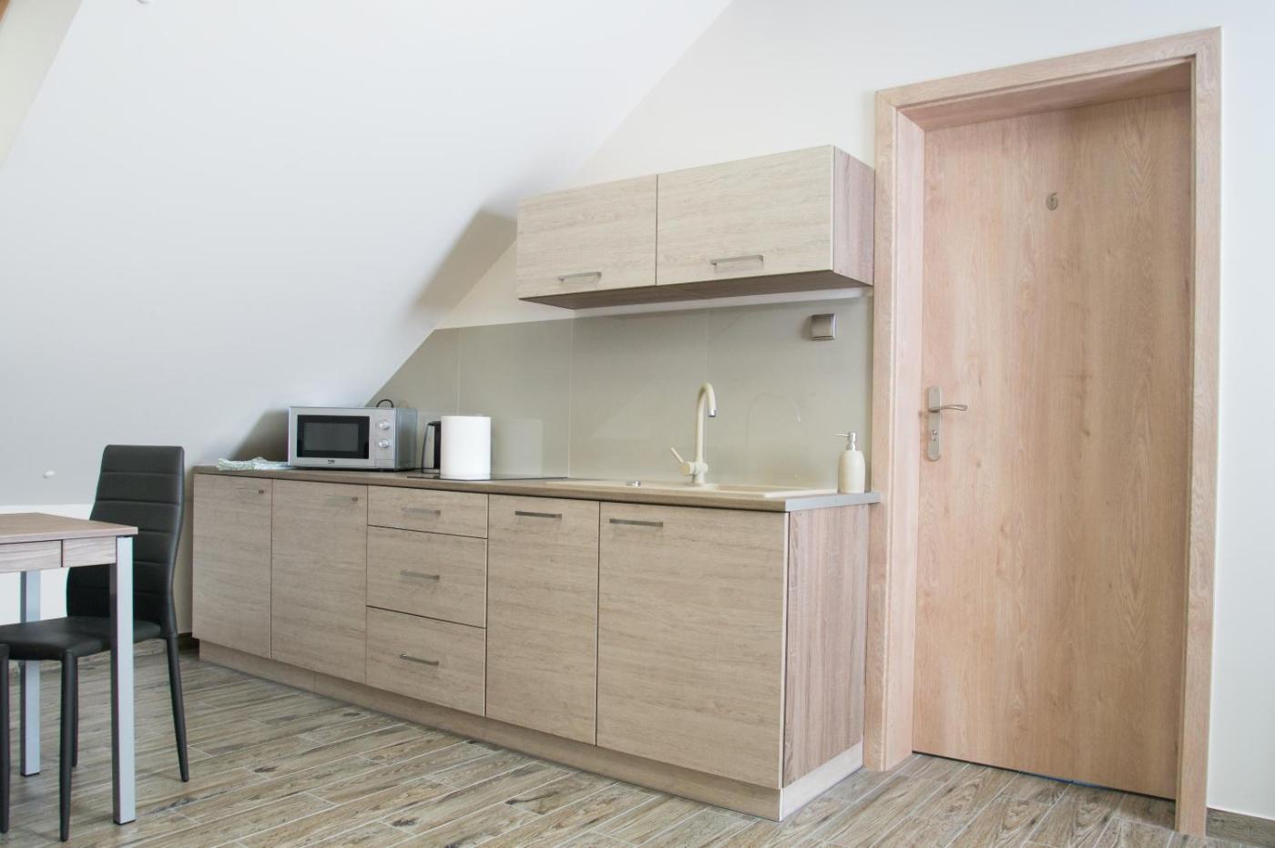 Apartament ze wspólną łazienką. The apartment provides a tea and coffee maker and a dining area, as well as a shared bathroom featuring a shower. Guests can make meals in the kitchenette that comes with a stovetop, a refrigerator, a dishwasher and kitchenware. This apartment features a private entrance, flat-screen TV, garden views, as well as chocolate for guests. The unit offers 4 beds. Apartament - 6 osobowy. Powierzchnia pokoju ok.: 45 mkw. ;